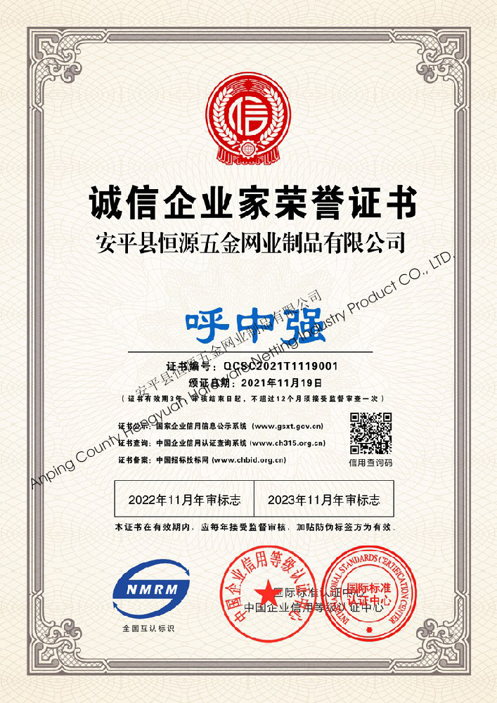 多年來(lái),安平縣恒源五金網(wǎng)業(yè)制品有限公司堅(jiān)持“科技興企、質(zhì)量立業(yè)”的經(jīng)營(yíng)理念和“誠(chéng)心為本、客戶(hù)至上”的合作宗旨,優(yōu)化生產(chǎn)工藝,打造優(yōu)質(zhì)產(chǎn)品,提供完善的服務(wù),受到國(guó)內(nèi)外客戶(hù)的一致好評(píng),產(chǎn)品行銷(xiāo)全國(guó)各地,并出口美國(guó)、德國(guó)、韓國(guó)、日本、臺(tái)灣等國(guó)家和地區(qū)。